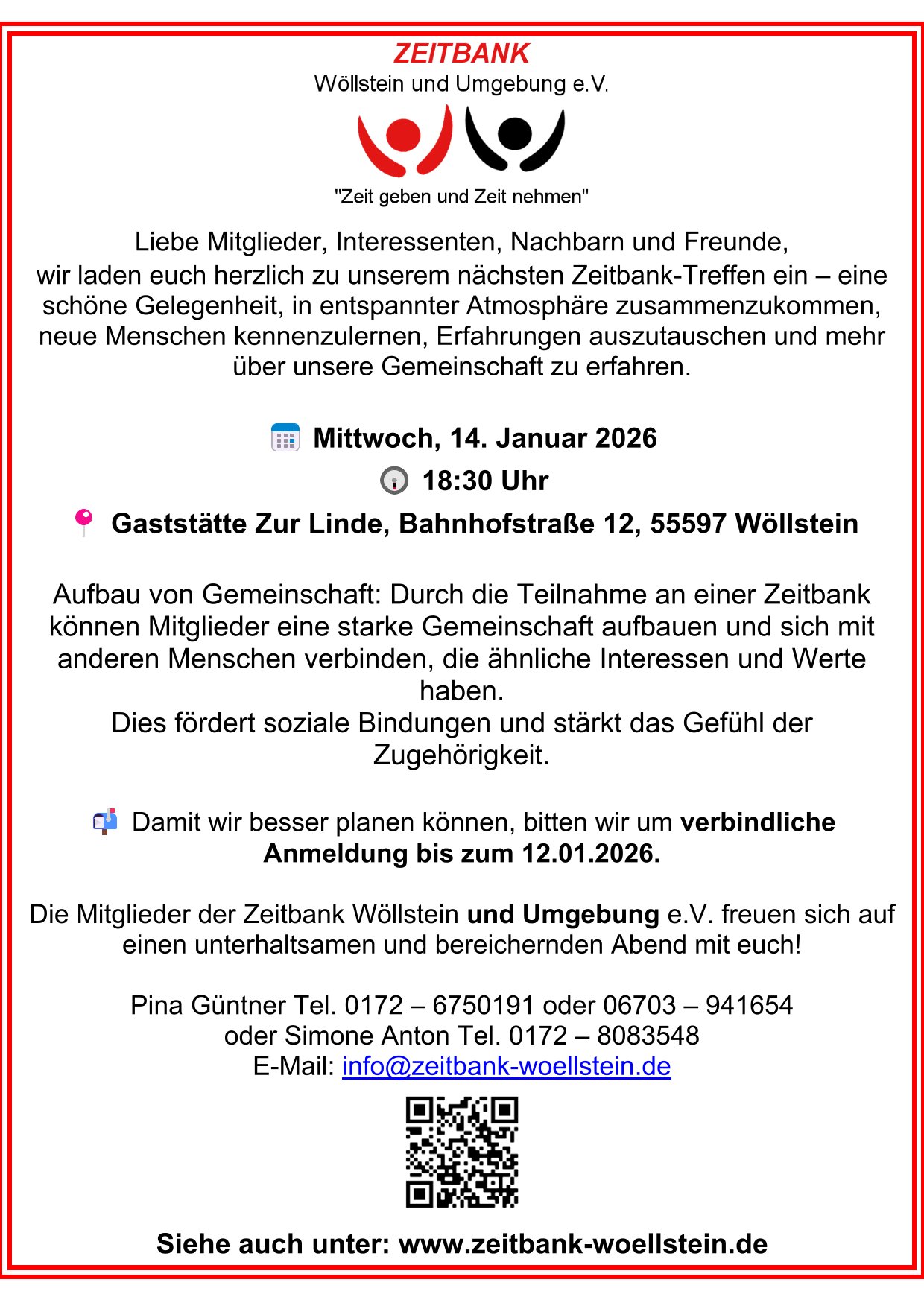 0172 – 6750191 oder 0172 – 8083548 oder per E-Mail: info@zeitbank-woellstein.de